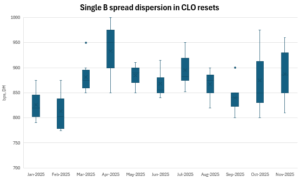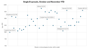 Single B rated tranches of resets from October and November have priced as tight as 800bps and as wide as 975bps DM, according to LFI data, compared with a much narrower range in the previous six months. September’s range was, for example, 800-850bps, with just one outlier at 900bps DM.